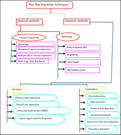 In the present time, thin films can be fabricated in various ways. The techniques can be divided into physical methods (Top-down approach) and chemical (Bottom-up approach) methods as described in Table 113, 14.