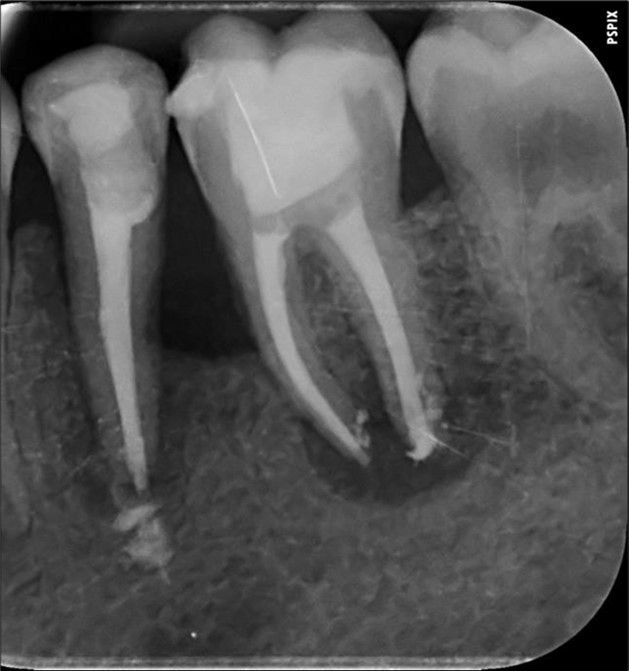 Periapical radiography (phosphorus number 2 plaque and X-MIND® Unity; Acteon) and cone-beam computed tomography (X-MIND® 3D; Acteon) (80 × 80, 150 Micron) were performed and showed periapical lesions on teeth 14, 15, 16, 24, 25, 26, 35, 36, and 46, as well as advanced endo-perio lesions on teeth 26 and 16. orthopantomogram (X-MIND® 3D; Acteon) and bitewings (phosphorus number 2 plaque and X-MIND® Unity; Acteon) also showed wide pulp chambers and roots canals. Figure 1, Figure 2