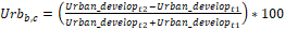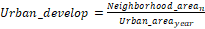 Urban development is the proportion of urban area within each analyzed neighborhood. Urbb,cis a normalized change index between dates t1 and t2 for each neighborhood. This index provides a relative measure of the normalized change for each neighborhood.