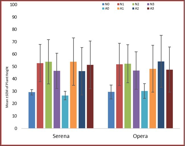 Considering Table 2, and Figure 2, the results showed that the Plant Height of Serena and Opera cultivars was significantly influenced by application of Argel or Nitrogen as fertilizers (F= 4.28, P <0.0012). Moreover, the Nitrogen level N2 and Argel level A1 gave the highest Plant Height (53.88, 53.97 cm) for Serena compared to other treatments, while N1 and A2 gave the highest Plant Height (52.97, 54.19 cm) respectively for Opera compared with the other treatments. Furthermore, the result exhibited there is no significant difference in the plant height of Serena and Opera cultivars as a result of application of either Argel or Nitrogen. In addition, the plant height of the two the cultivars responded equally to Argel and Nitrogen applications (F=0.03, P < 0.877).