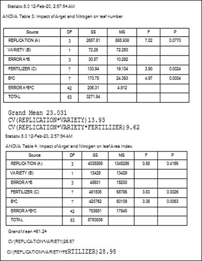 Furthermore, the result presented that there is no significant difference in the leaf number of Serena and Opera cultivars as a result of application of either Argel or Nitrogen. Additionally, the leaf number of Serena and Opera cultivars responded similarly to Argel and Nitrogen (F=7.02, P < 0.0770)