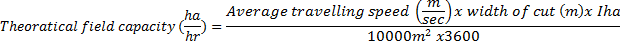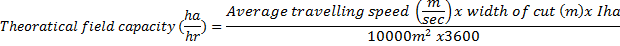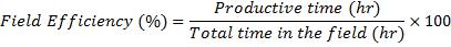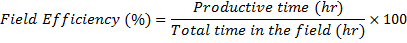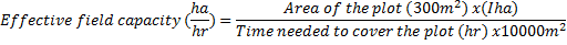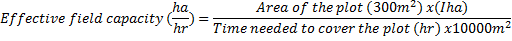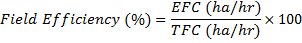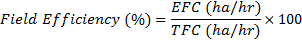 The time lost in the field such as turning, adjustment and change of gear was recorded and time used for real work also recorded. The theoretical, effective field capacity and field efficiency were calculated as follows