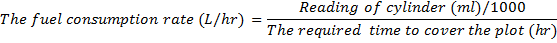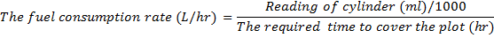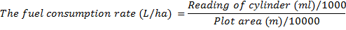 For measuring the fuel consumption of tractor, the fuel tank was filled up to neck of the fuel tank before and after the planting operation in each plot. The amount of refilling measured after the test was the fuel consumption for planting operation in each plot and it was expressed as liter per hour and calculated as follows: