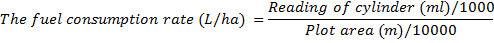 For measuring the fuel consumption of tractor, the fuel tank was filled up to neck of the fuel tank before and after the planting operation in each plot. The amount of refilling measured after the test was the fuel consumption for planting operation in each plot and it was expressed as liter per hour and calculated as follows