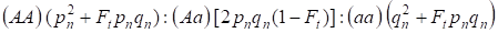 This formula follows from the following logic of mating: the origin of identical alleles in homologous autosomes is non-consanguineous (the probability of this hypothesis is P(H1) = 1– Ft )also arises homozygoteаа (conditional probability of this event is P(aa/H1) = q2) or origin of identical alleles is consanguineous (the probability of this hypothesis is P(H2) = Ft ) and arises homozygoteаа (conditional probability of this event is P(aa/H2) = q). The probability q of the homozygote aa occurrence in the latter case is determined by that if allele a is in one autosome then at consanguineous origin of homozygote same allele necessarily should be and in the homologous autosome.