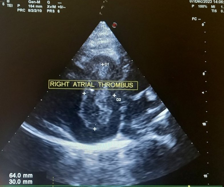 Figure 3.Transthoracic echocardiography, apical four chambers view . Apical displacement of the tricuspid valve (a) and right atrial thrombus (b).