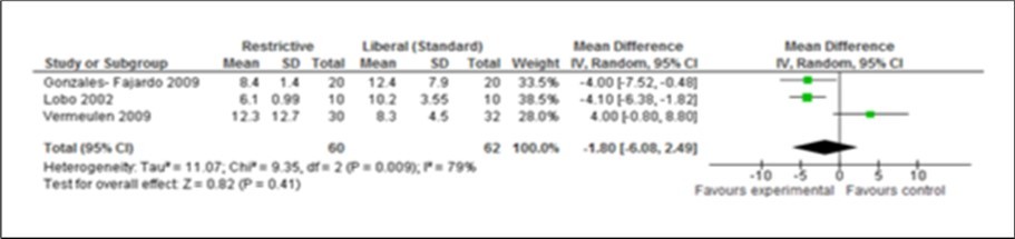 The two measurable outcomes in this analysis were the common endpoints used for all studies in this meta-analysis. Assessing these variables as either primary or secondary was not consistent and uniform in the eight studies. However, restrictive fluids tend tohave better outcome with less complications and shorter hospital stay. A reduction of 2 days (Figure 2, Figure 3, Figure 4, Figure 5) seen in the restrictive study group then the liberal group. The use of either liberal or restrictive fluid in the post operative study have shown no effects on the outcome. It is unfortunate that this evidence is seen in three studies only. Therefore, a firm conclusion from this result cannot be established.