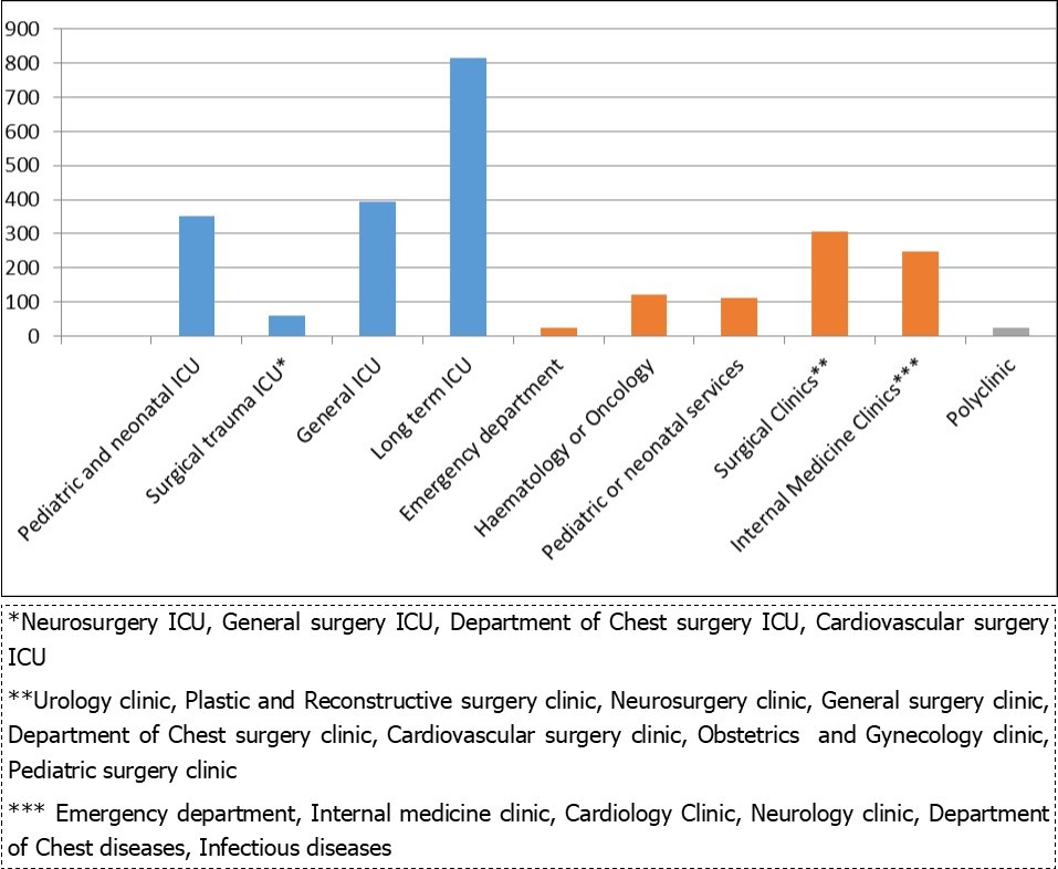 Resistance to carbapenems (imipenem / meropenem) in the 2018 CAESAR report was comparable to that in previous years for K. pneumoniae. High levels of resistance of K. pneumoniae to third-generation cephalosporins (cefotaxime / ceftriaxone and ceftazidime) and fluoroquinolones (ciprofloxacin / levofloxacin / ofloxacin) were observed 13. In our study, ceftriaxone resistance was determined above country data. This may be due to the fact that it is a commonly used agent in empirical treatment of infections with both Gram positive and Gram negative bacteria in our hospital.