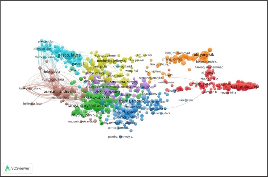 In terms of influence in Table 10 measured by citations, David Tilman tops the list with 22855 citations from just 13 documents, signifying groundbreaking work. Yong Sik Ok appears again, reinforcing his dual role as both productive and highly cited. Johan Rockström and Jason Hill, with fewer documents (8 and 5, respectively), have garnered substantial citations (16060 and 14293), highlighting the profound impact of their research. This analysis underscores the significant global efforts and contributions of these leading researchers in advancing the understanding and application of sustainable food systems, with a particular focus on edible insects, sustainability, and nutrition.