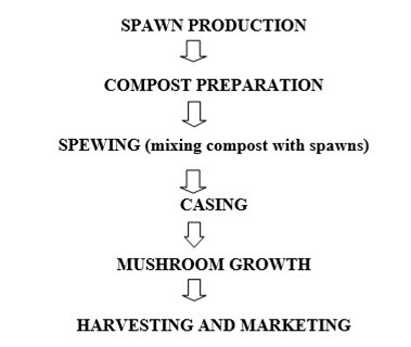 Fungi produce variety of enzymes and secondary metabolites which includes organic acids, pigments and other food additives. Also, it showed remarkable role in pharmacological application than to their nutritional value. Mushroom is a nutritious vegetarian delicacy and has many varieties which are almost edible in nature. It contains many vitamins and minerals but very low on sugar and fat.11. It was also found that 14 to 27% crude protein on dry weight basis in Agaricus bisporus, Lentinus subnudus, Calocybe indica7. Mature fruit body of Calocybe indica contains highest protein while young pin heads contain the lowest proteins10. In earlier history, Mushrooms were included in diet by Greeks and Romans were included mushrooms in their diet and considered as food of God1,6. Mushrooms produce a number of volatile compounds that will vary with the species, variety and conditions9. Milky mushrooms is morphologically resembles like button mushroom and it has been popular in southern Indian states and also it is slowly getting popular in other countries5,8. The required temperature is between 20 and 30 degree Celsius and required relative humidity is 55 to 75%. Therefore, North-East region has very good prospects and deals in cultivation as well as processing. The common substrates are Paddy straw, wheat straw, coconut coir pith which is widely used for mushroom cultivation2,3. Among this, the easiest and cheapest substrate used to grow Milky mushroom is Paddy straw. Milky mushrooms do not require huge investment and very easy to grow. Hence, this deals with cultivation and processing of milky mushrooms.