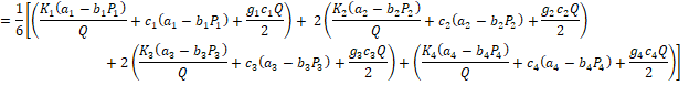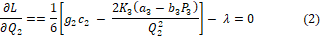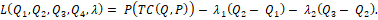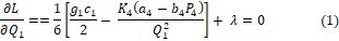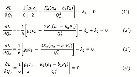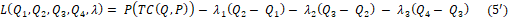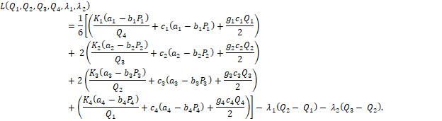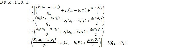 The above derived results depict that Q1 > Q2 > Q3 > Q4 failing to satisfy the constraints 0 ≤ Q1 ≤ Q2 ≤ Q3 ≤ Q4 . So, converting the inequality constraint Q2 - Q1 ≥ 0 into equality constraint Q2 - Q1 = 0 Optimizing P(TC(Q,P) subject to Q2 - Q1 = 0 by Lagrangian method.