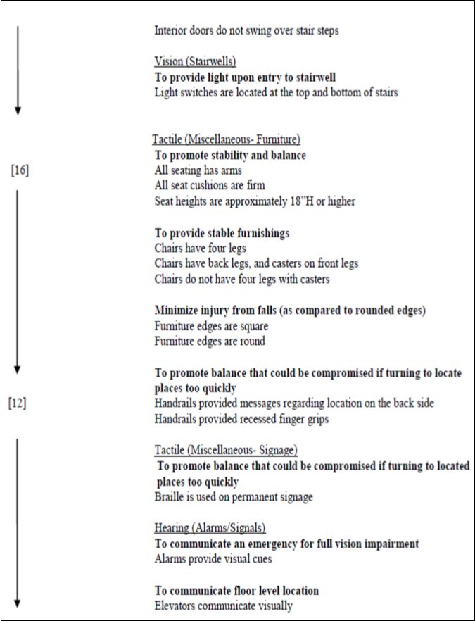 The value of continued use of the checklist provides the opportunity for all aspects of the physical environmental to be investigated. Further knowledge of the factors that influence aging adults’ ability to safely maneuver an environment highlight the need for continued investigation. It was found that good design cannot overcome all impairments. For example, enhanced lighting levels cannot compensate for an ALF resident in a weakened state who trips and falls due to a gait issue, or who cannot rise from a chair to exit a room through a door frame that contrasts with the wall. Further research could identify a level of influence sensory cues can have on specific levels of impairments.