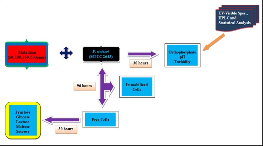 Pesticides are applied in agricultural fields for controlling pest population to achieve crop protection. But they cause damage to nontarget organisms and affect the quality of environment including water, air and soil. The present study has been designed to test the efficiency of Pseudomonas stutzerion the degradation of malathion. The bacterial strain was subjected to 50, 100, 150 and 200 ppm of malathion in minimal broth for 30 hours and changes in orthophosphate levels, pH and turbidity were monitored for every six hours. Efficiency of free and immobilized cells were compared for orthophosphate release. Influence of different sugars on degradation was also compared. Degradation of 150 ppm of malathion was confirmed with UV-Visible spectrophotometric analysis and HPLC analysis. The data were subjected to two way analysis of variance and the results are discussed.