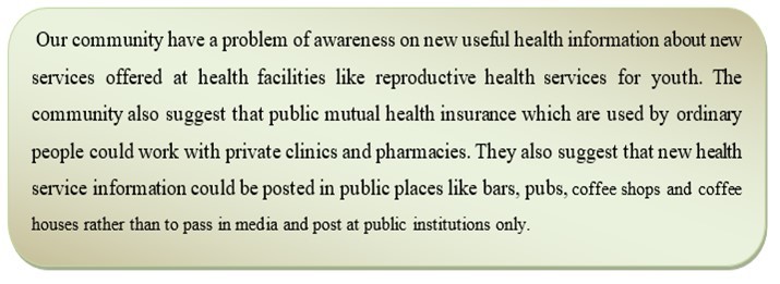 During the interview, community health officerssaid they community have a problem of unwanted pregnancies in youth may be due to lack information about reproductive health service offered at health facilities. Another community need is to license private clinics to receive clients of a public mutual health insurance because patient are overloaded at public health facilities whereas private clinics have no more clients. The community also need that new health service information could be posted in public places like bars, pubs, coffee shops and coffee houses rather than to pass in media and post at public institutions only.