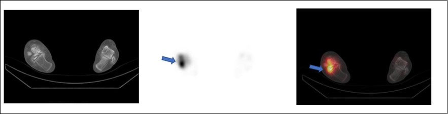 SPECT/CT depicting increased tracer uptake after one month at the site of allogenic bone grafting (same above patient) done for avascular necrosis right talus.